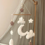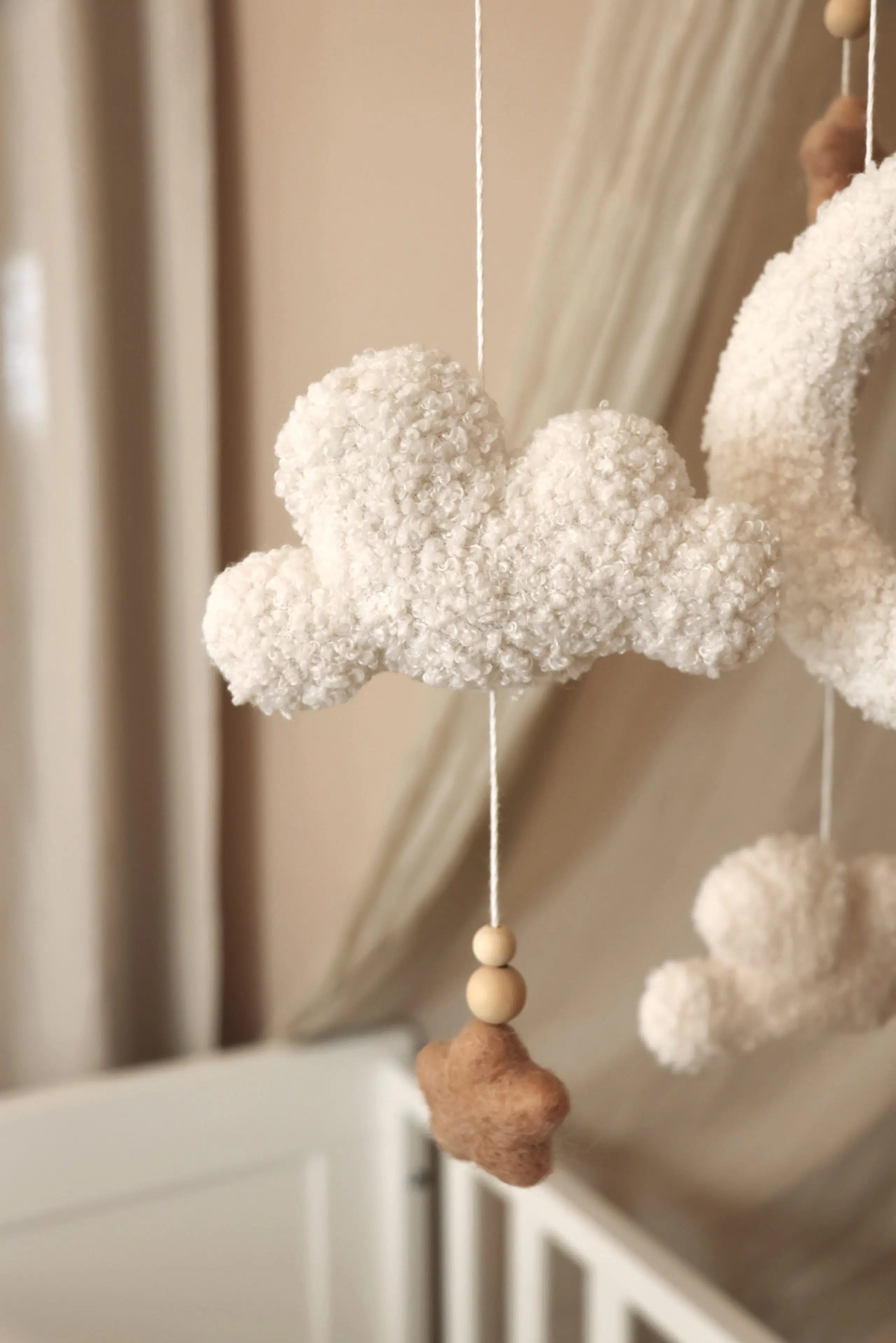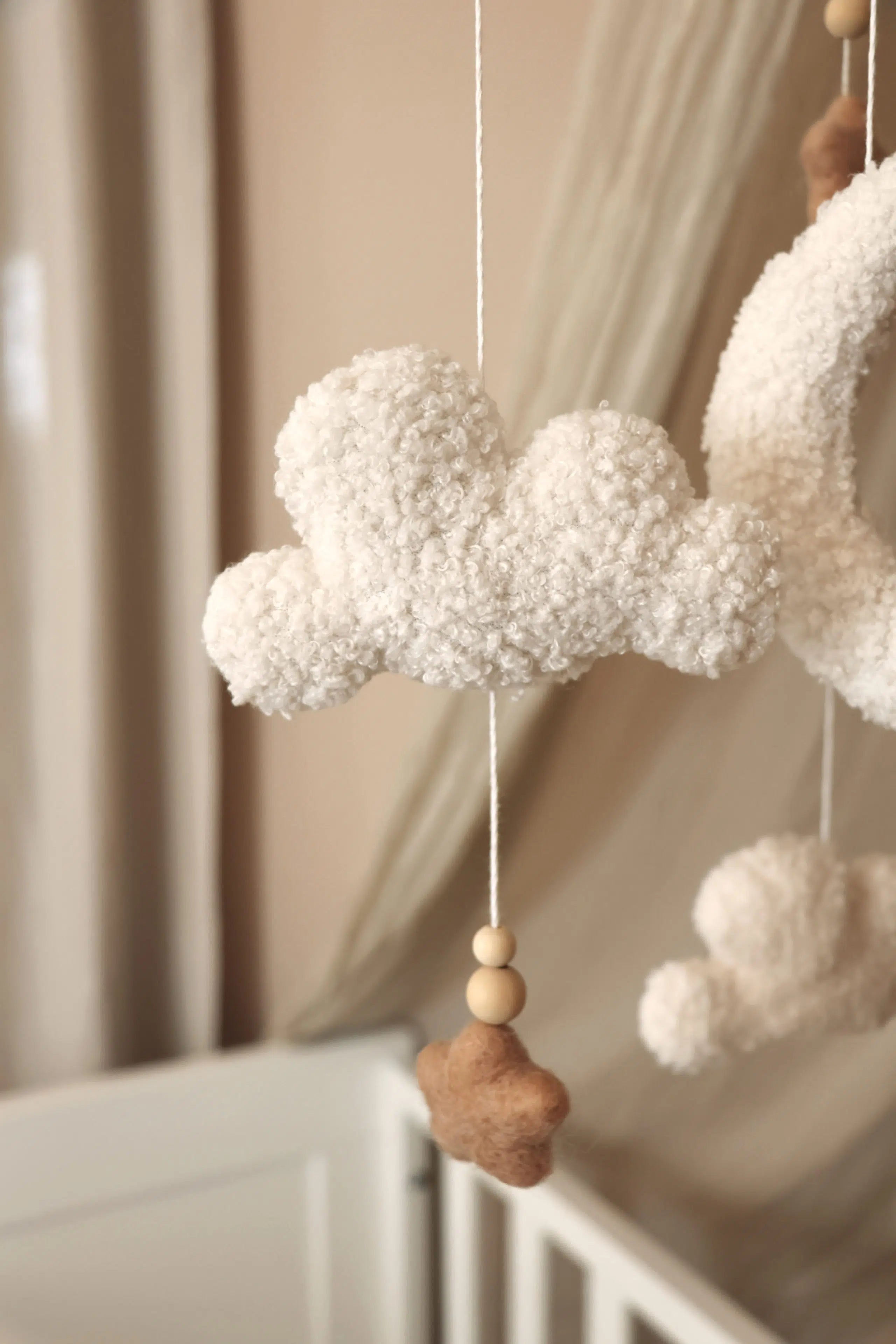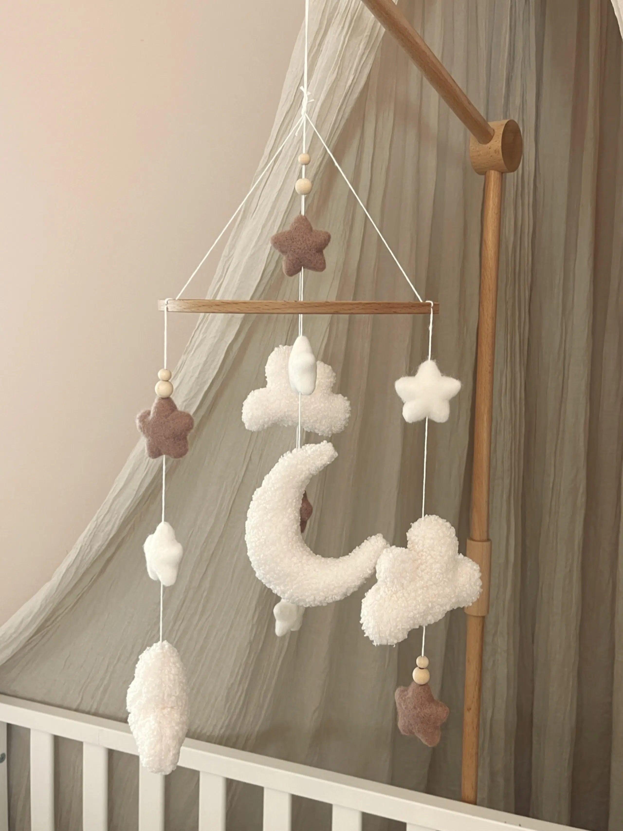 Creëer een dromerige en rustgevende sfeer voor je kleintje met onze prachtige baby mobiel. Deze fluffy clouds mobiel is voorzien van zachte, fluffy bouclé wolken, een maan en kleine sterretjes allemaal in zachte en neutrale kleuren. Alle figuurtjes hangen stevig aan een houten ring met duurzame touwen.