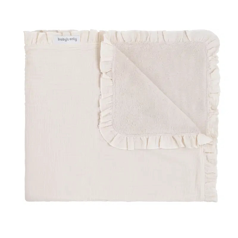 De bovenkant van de deken is afgewerkt met speelse ruches, wat een unieke, elegante uitstraling geeft. Deze subtiele details voegen een speelse touch toe, terwijl ze ook de tijdloze klasse van de Calm Collectie onderstrepen. Het ontwerp is perfect afgestemd op ouders die houden van stijl en eenvoud, zonder in te leveren op comfort.