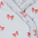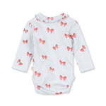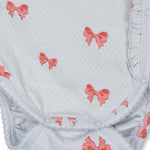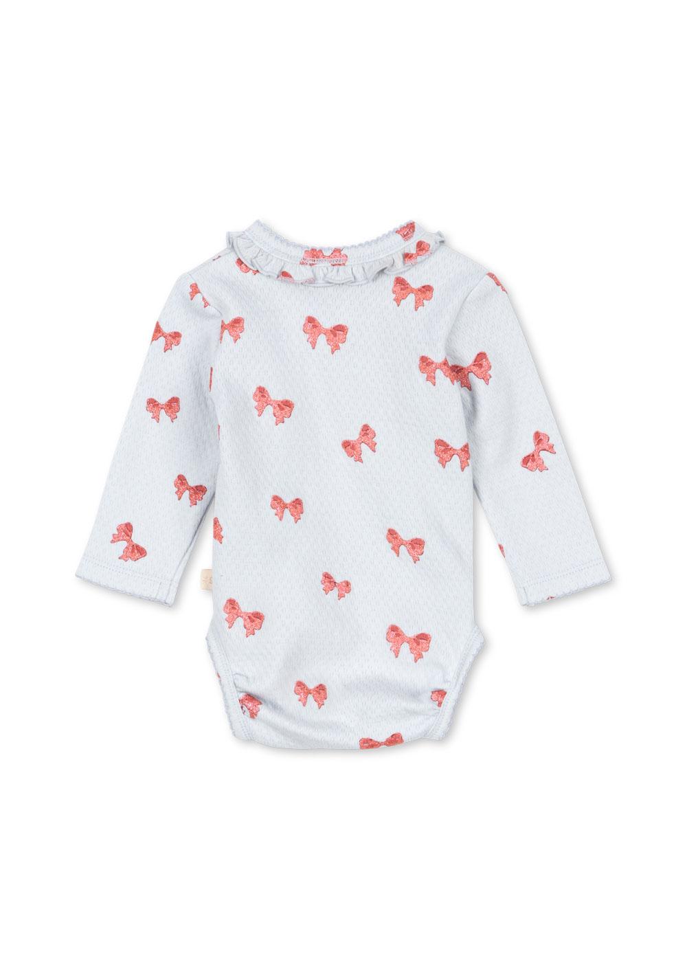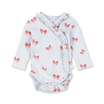 Zachte katoenen body voor pasgeborenen met gemakkelijke wikkelsluiting en ruches. Drukknoopopening langs het lichaam en de beenopening voor gemakkelijk aankleden. Gemaakt van 100% biologisch katoen.