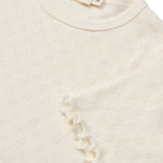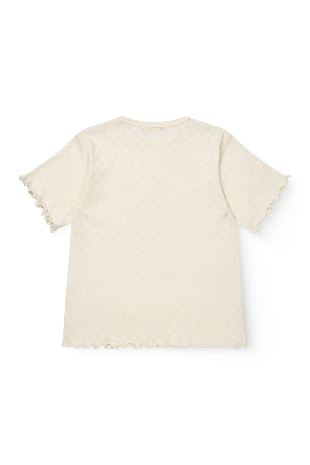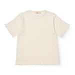 Pointelle T-shirt van biologisch katoen. Ontworpen met korte mouwen en een babylock-afwerking aan de mouwen en onderzoom voor die schattige, zomerse look. De fijne pointelle met kleine hartjes is gemaakt in een superzachte jerseykwaliteit.
