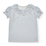 De blouse heeft charmante pofmouwen, een kraagje met fijne ruches en een knoopsluiting met druppelvormige opening op de rug.