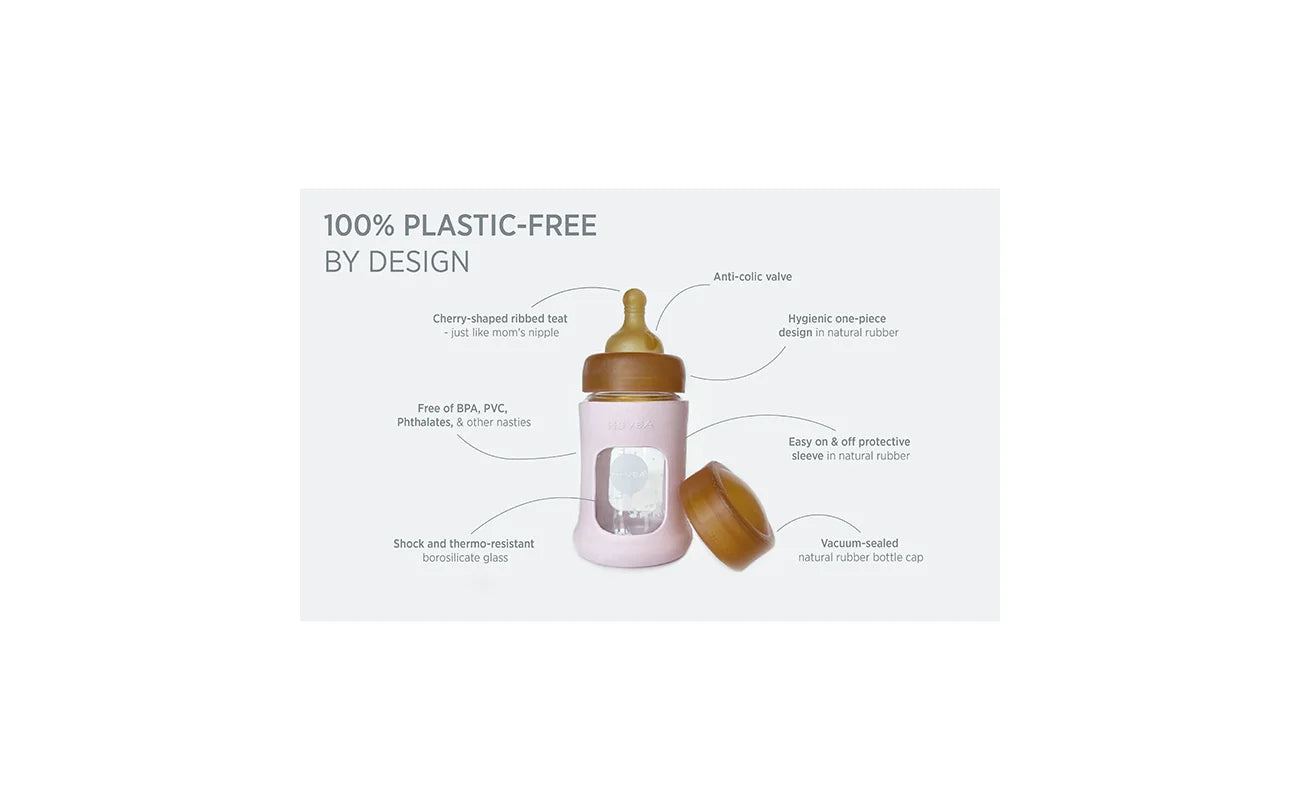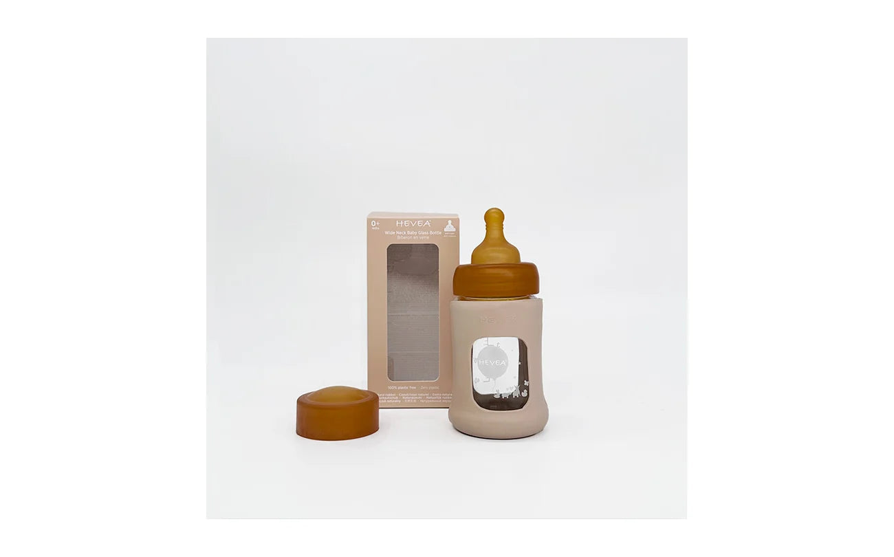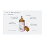 Volledige plasticvrije zuigfles met brede hals en rubberen sleeve. De beste ecologische, natuurlijke babyfles op de markt.