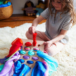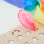 Ons Playsilk Weefbord is een geweldig herbruikbaar knutselproject voor kinderen van 3 tot 7 jaar. De zacht geschuurde gaten kunnen op allerlei manieren worden doorweven met Playsilks om prachtige ontwerpen te maken.