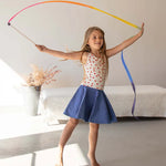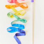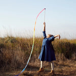 De Regenboog Streamer is een houten toverstok met een glinsterende zijden streamer, afgewerkt met een decoratieve houten kraal. Leuk om mee te zwaaien in de wind, letters in de lucht te schrijven, te doen alsof je vist, te dansen en meer.