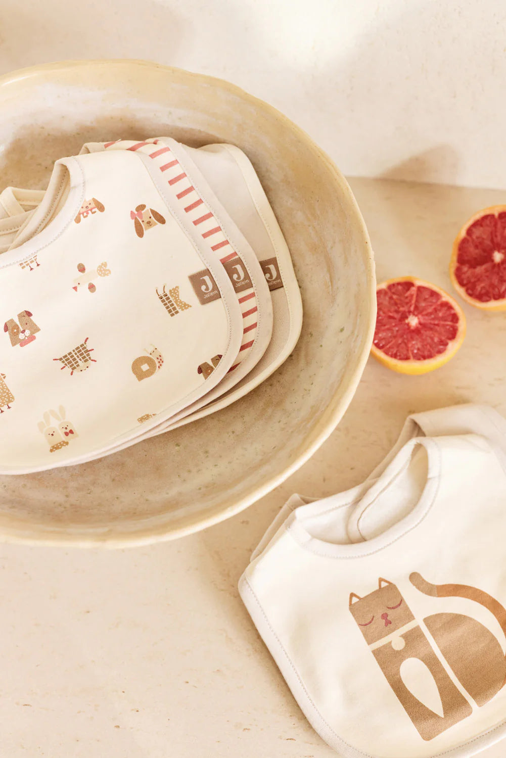 Deze 5-pack waterproof slabbetjes maken het ouderschap een stuk eenvoudiger! Dankzij de handige klittenbandsluiting trek je ze snel aan en uit, zonder gedoe. De slabbetjes houden de kleding van je kleintje schoon en droog, zodat jij kunt genieten van de momentjes samen. Elk slabbetje heeft een schattige Animal Friends print. Welke diertjes herkent jouw kleintje in deze slabbetjes?