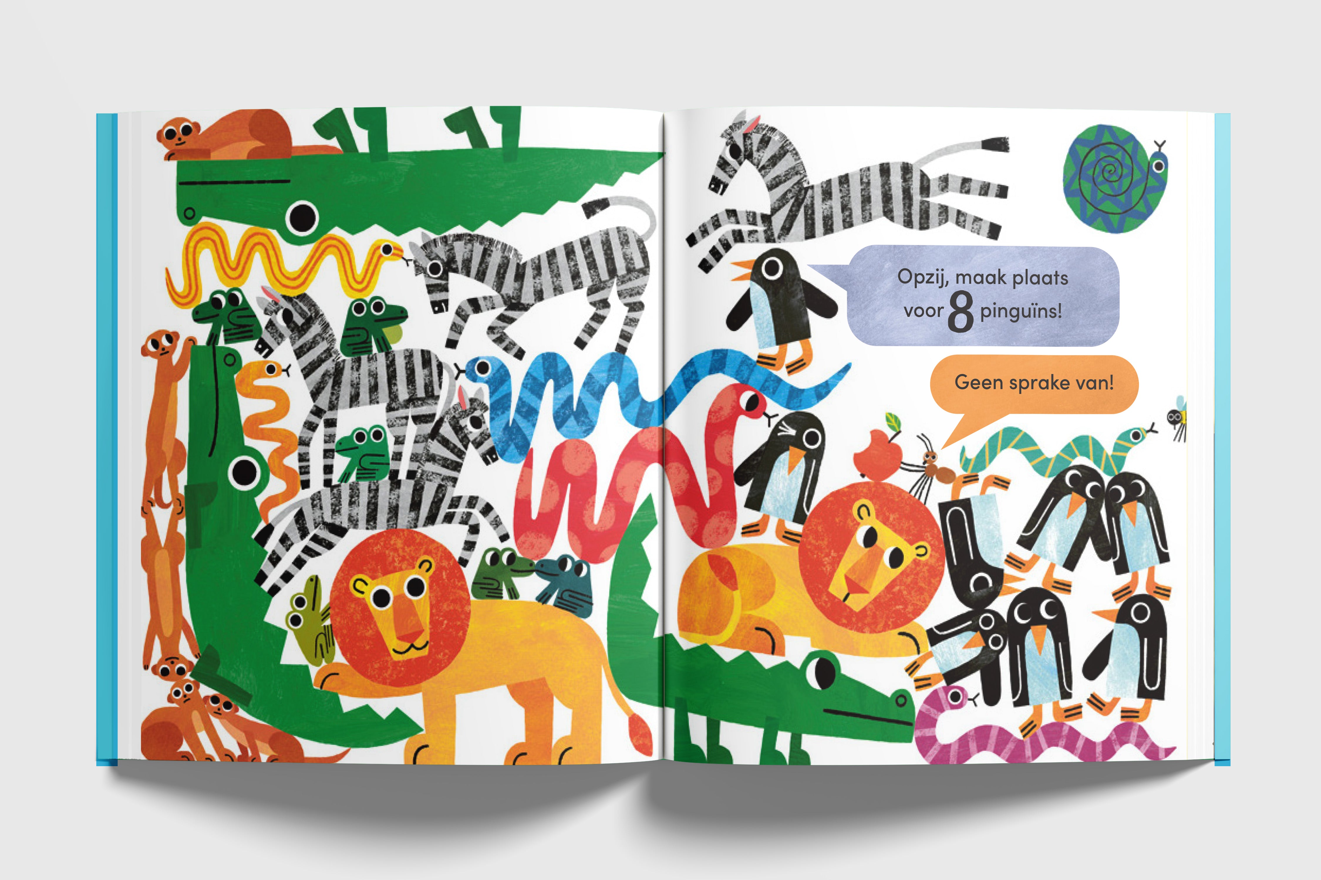 Maar dat is kletskoek! Er passen zeker nog wel twee leeuwen bij. Plus een krokodil of drie. En als dat gaat, hoe zit het dan met de vier zebra’s die er ook nog bij willen? Hoeveel dieren passen er eigenlijk in dit boek? In dit boek ontmoet je een eigenwijze mier die vindt dat er maar één dier in het boek past. Maar wat gebeurt er als andere dieren zich ook willen laten zien?
