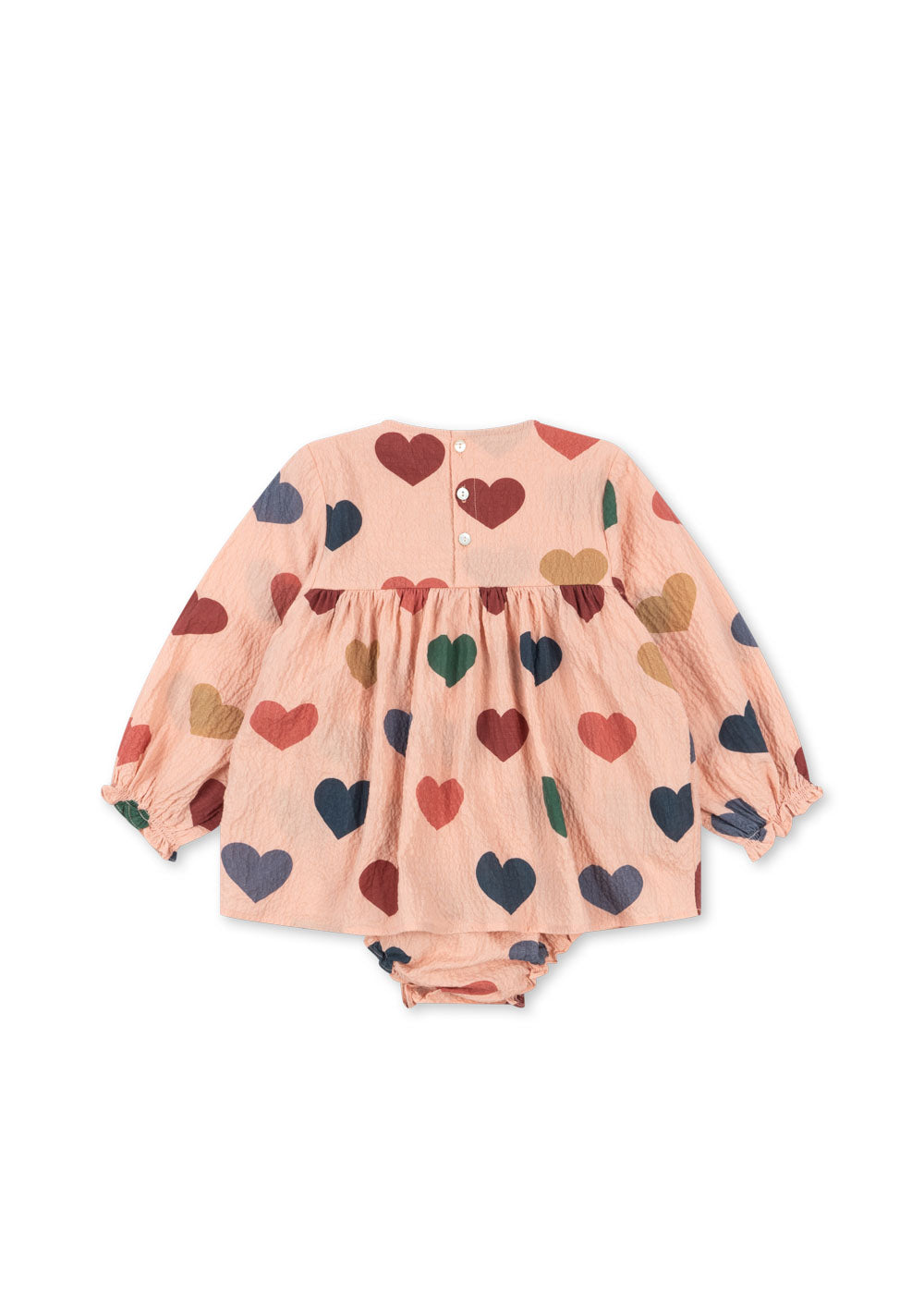 Romper van een zachte, gekreukelde seersuckerstof met plooitjes bij de polsen. Voorzien van knoopjes bij de beenopeningen voor gemakkelijk aan- en uittrekken. GOTS-gecertificeerd, biologisch, gecertificeerd door CU1094701.