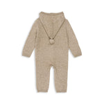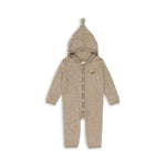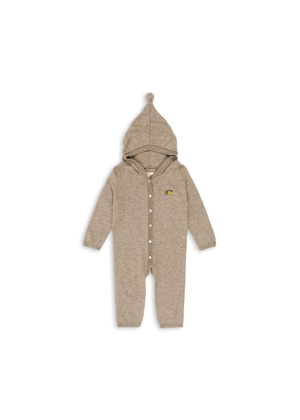 Een uitzonderlijk warme en zachte gebreide onesie, perfect voor dutjes in de kinderwagen of buggy, of als extra warme laag op koude dagen. Gemaakt van ademende merinowol met ribboorden, een zachte capuchon en parelmoeren knoopjes aan de voorkant.