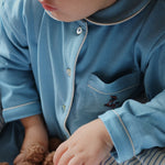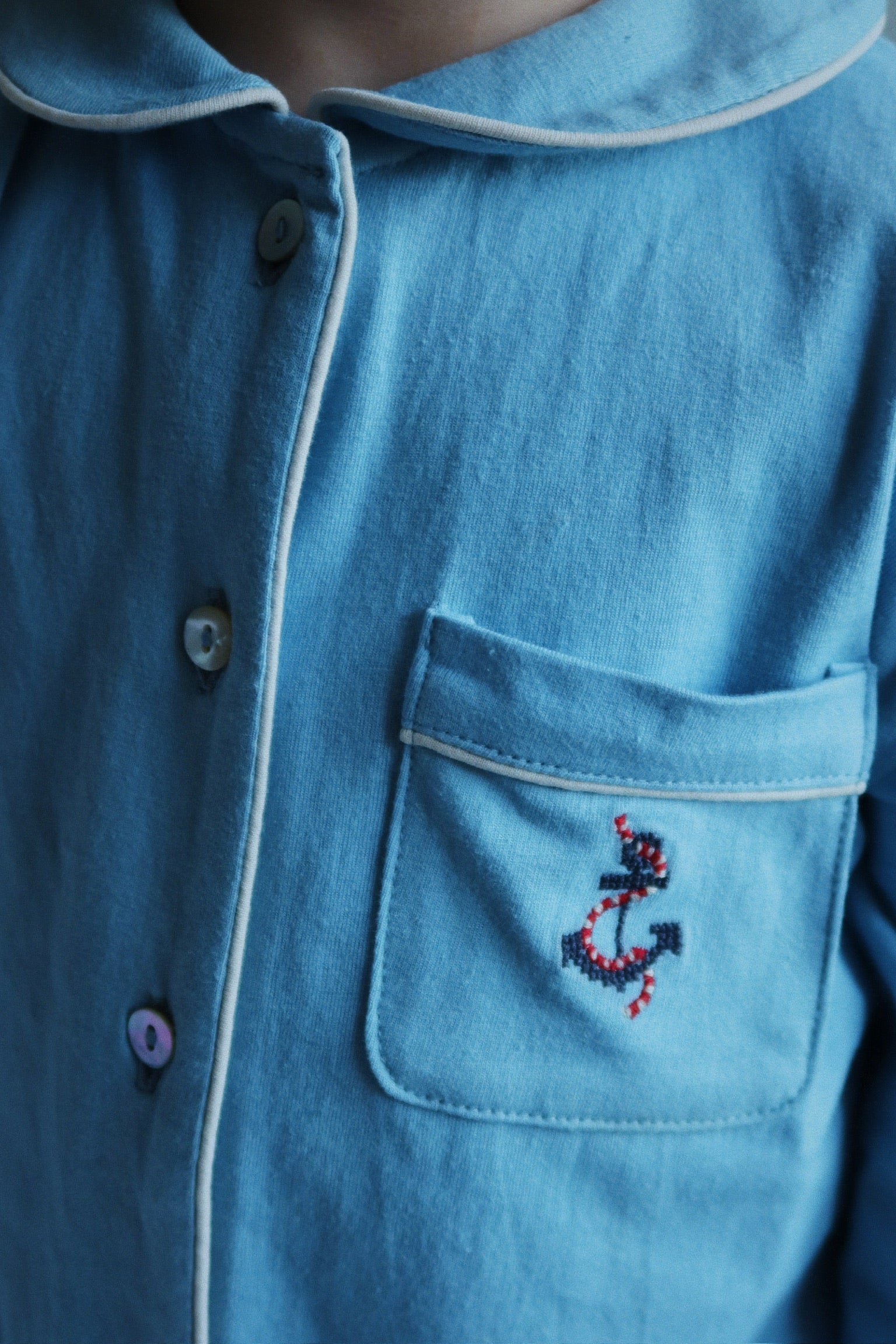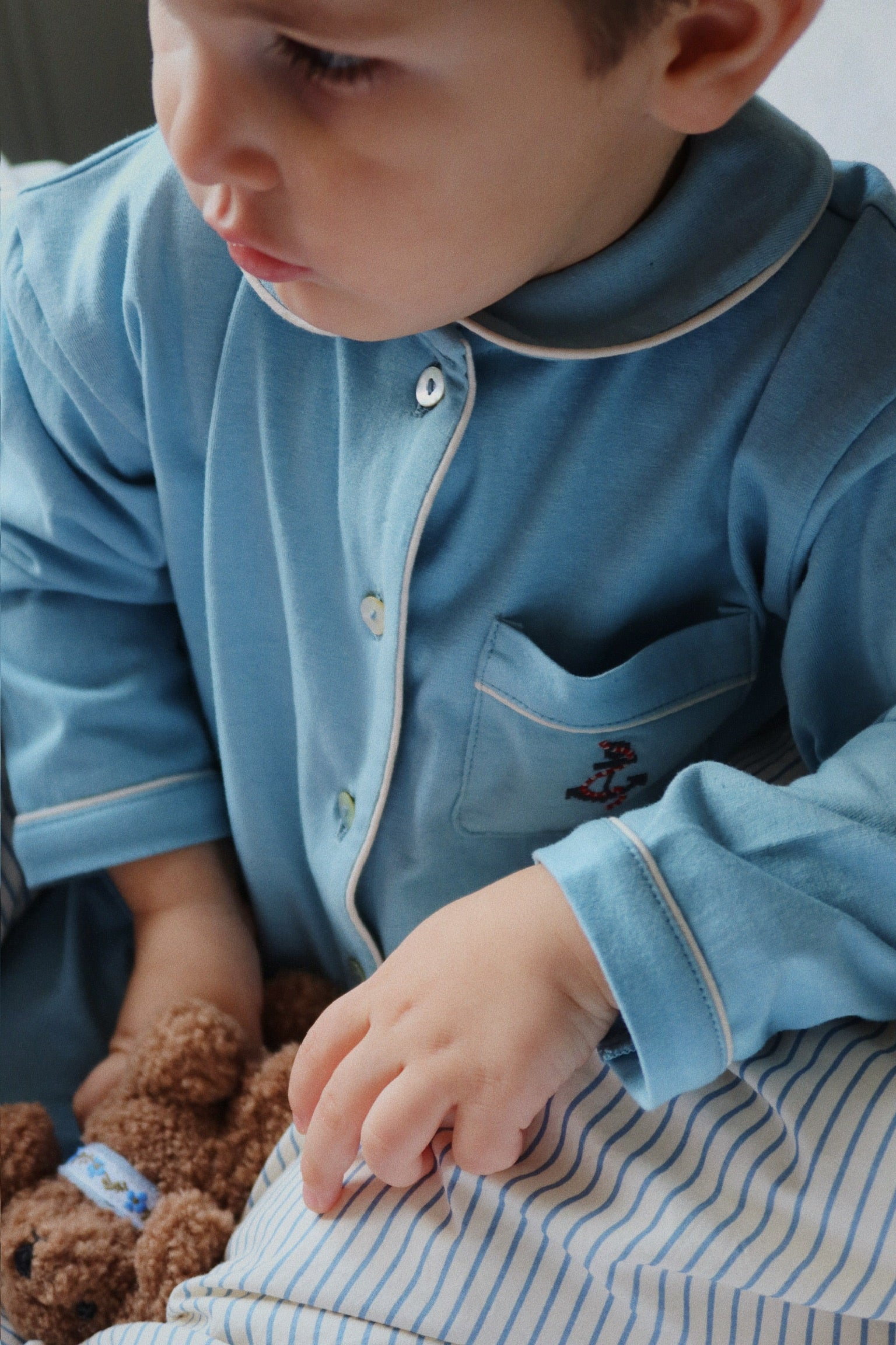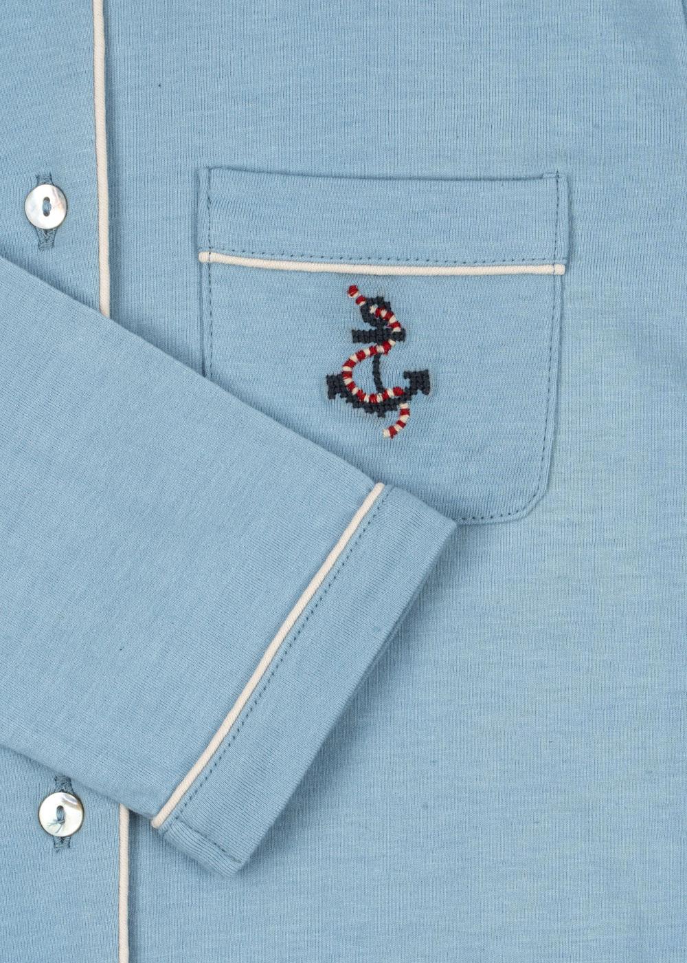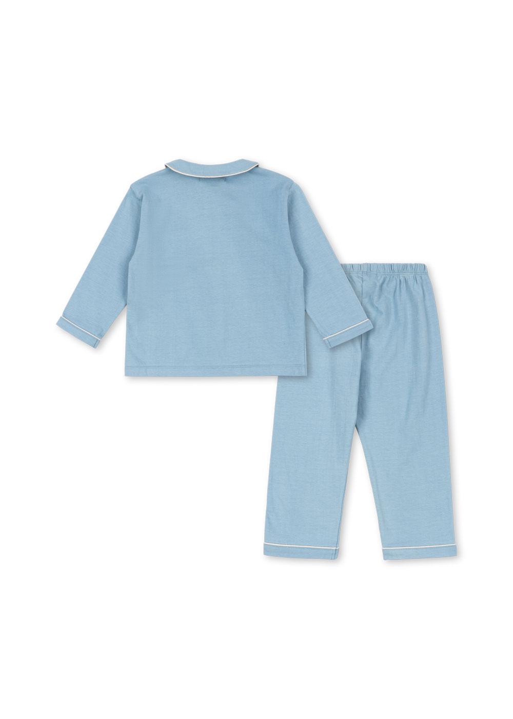 Zachte jerseyset, gemaakt voor rustige en comfortabele dagen thuis. De set bestaat uit een klassiek pyjamashirt en een zachte broek met elastische tailleband. Gemaakt van 100% biologisch katoen. GOTS-gecertificeerd, biologisch, gecertificeerd door CU1094701.