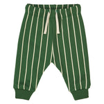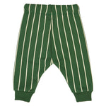 De broek is mooi groen met crèmekleurige horizontale strepen.
