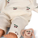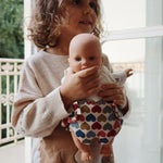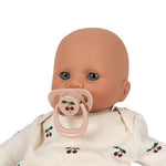 Zachte en knuffelige pop gekleed in een schattige set van biologische katoen met een blouse en broek. Gemakkelijk voor het kind om aan en uit te trekken. Inclusief een fopspeen om de pop zachtjes te troosten.