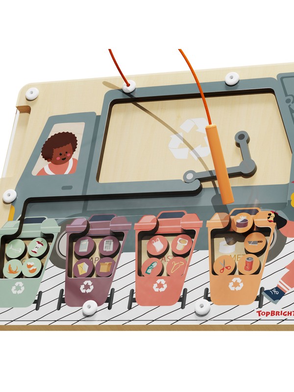 In welke afvalbak hoort het lege yoghurtbekertje? Met het magnetische labyrint Afval Sorteerder leren kinderen vanaf 36 maanden op een speelse manier de basis van afvalscheiding. Met een magnetische pen sorteren ze het afval in de juiste bak: metaal, papier, plastic of GFT. Zo ontdekken ze recycling en milieubewustzijn.
