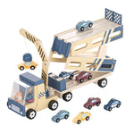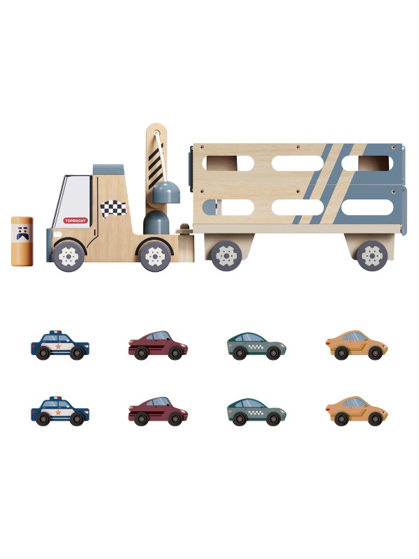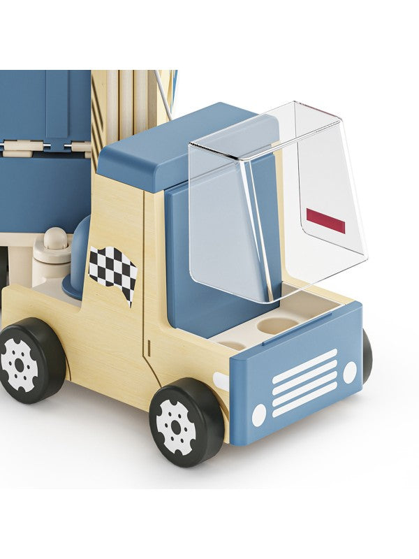 Op twee niveaus biedt de transporter plek voor maar liefst acht kleine auto’s. Met een paar simpele handelingen verandert de houten transporter in een 103 centimeter lange, dubbele racebaan waar kinderen stoere snelheidswedstrijden houden.