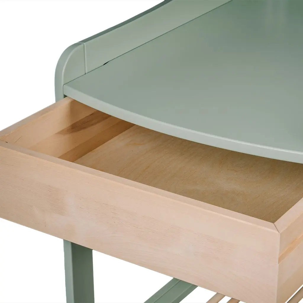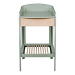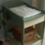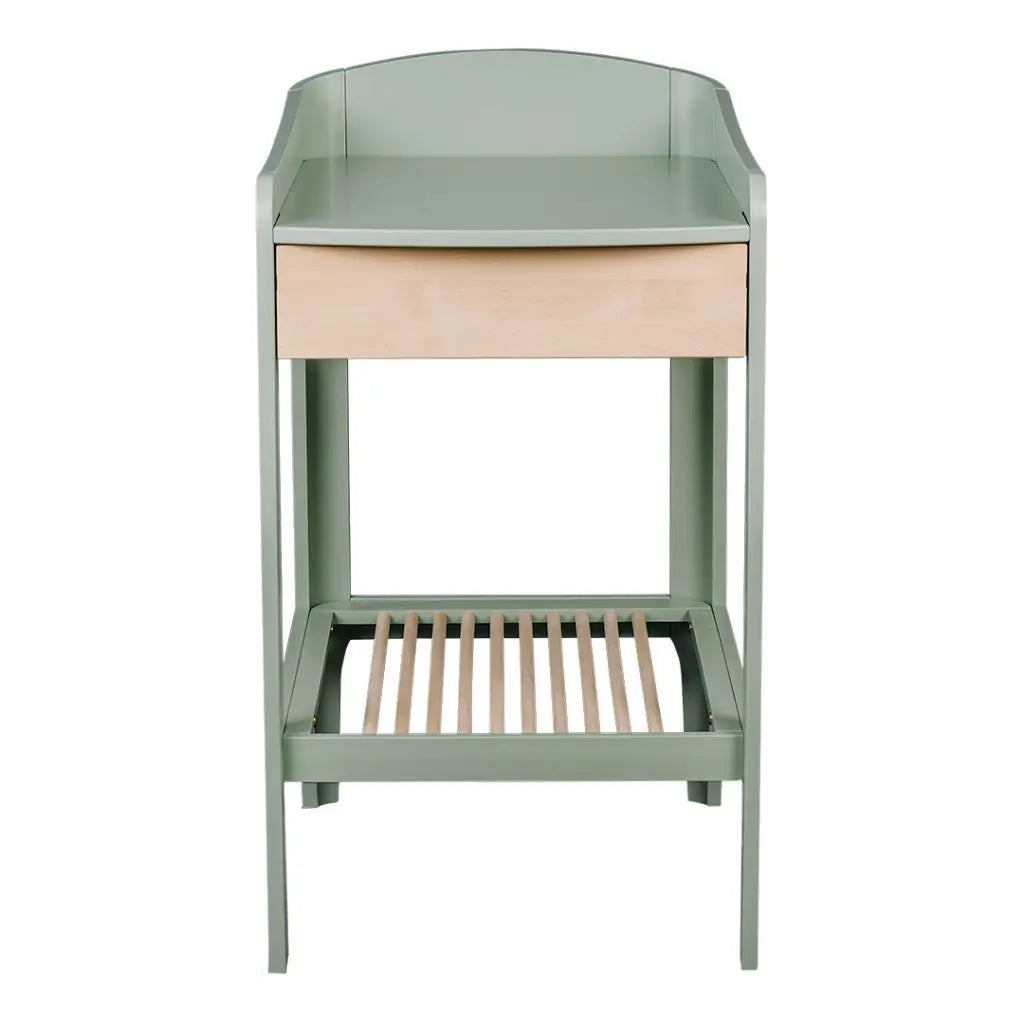 De verzorgingszone van 70 x 50 cm is omrand en biedt voldoende plaats voor een aankleedkussen en je kindje. Onder het blad vind je een uitneembare houten lade – ideaal om luiers, crèmes of kleine accessoires netjes op te bergen. Daaronder is een extra open legplank voorzien voor handdoeken, kleertjes of mandjes. Alles blijft overzichtelijk en binnen handbereik.