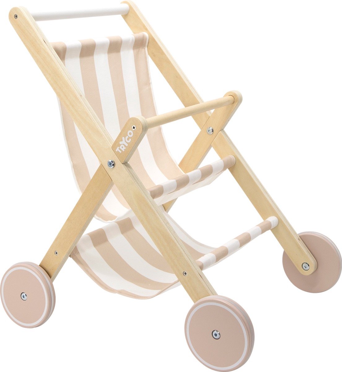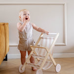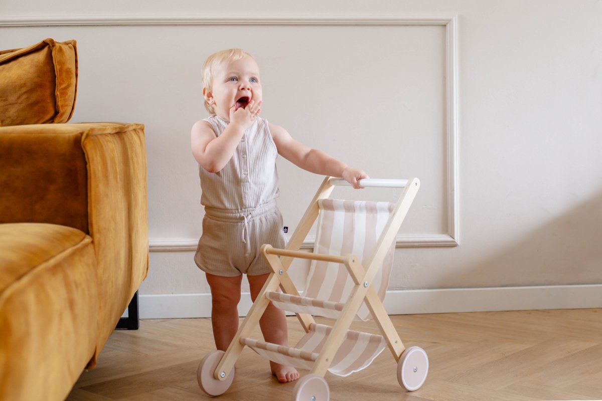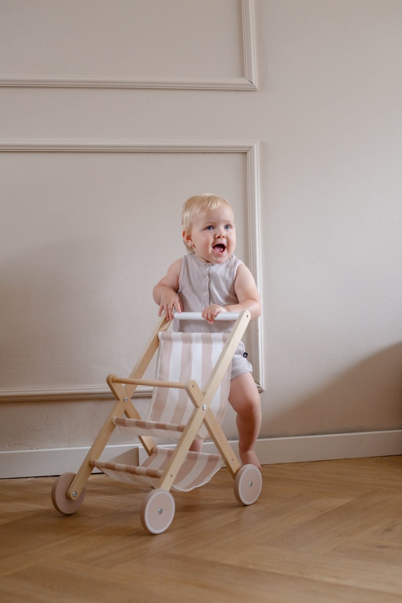 Het frame en de wielen zijn gemaakt van stevig hout en het zitje is gemaakt van stof met een leuke print. Hierdoor staat hij ook nog eens leuk in de kamer! Dankzij het boodschappenmandje onderin kan je kleine ook nog wat extra speelgoed meenemen tijdens de wandeling. Iedereen gaat mee op dit gezellig uitje!