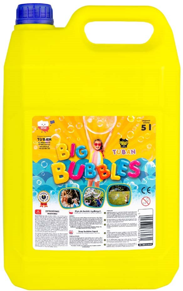 Welke zeepbellen vinden kinderen het leukst? Natuurlijk de grootste! Met Tuban 5l grote bubbelvloeistof kun je enorme, kleurrijke en duurzame bubbels maken met behulp van verschillende accessoires, zoals rietjes, ringen en touwtjes. Het unieke recept van Tuban vloeistof maakt het mogelijk om het maken van bellen-trucs en shows uit te voeren, zelfs door professionals.